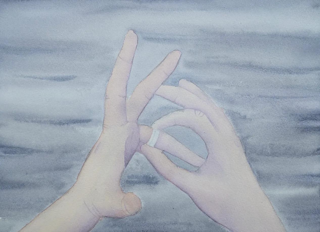 Summoning Spirit captures an intimate moment as my hands twist the rings in a subconscious ritual that brings comfort and peace. The ripples in the background evoke peace and the interconnectedness of all relationships. Purple represents spirit in the queer community, as I twist the rings and summon the strength of those who have gone before me. The perspective invites the viewer to consider the relationships from my point of view, as well as their own outside perspective.