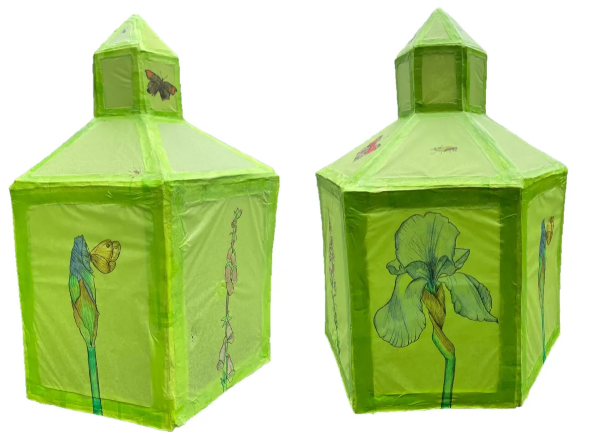 I chose to work on creating a sculptural piece reflecting both the fragility of building and the ethereal beauty of wildlife. Ttissue paper shows a glow of light, an element of both the hidden and the translucent, as well as fragility. Drawing insects and flora on such a fragile medium was tricky and I had to replace my use of paint or colour pencils with watercolour pencils, as they are softer. All this reflected the delicate balance between manmade and natural, also illustrating the need to consider replacing things in order for a successful outcome. The piece links back to the original terrariums, with its nod to insects, flora and tiny ‘houses’.