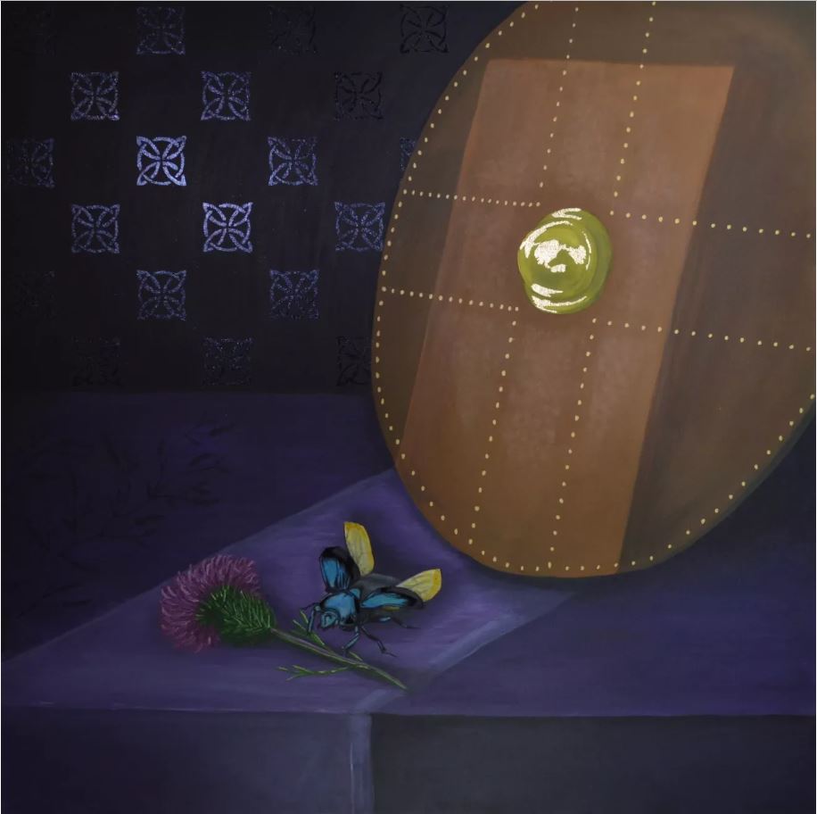 and Dutch artists representations of insects and flowers. Reda Abdel-Rahman uses symbols of his ancient heritage within his work together with use of colour, pattern and different mediums. He uses size and light to draw focus to the main message he wishes to convey. The metal leaf symbols are a representation of my heritage, they are arranged to mimic sunbeams coming from outside onto the still life subjects. The Tempera on the beetle’s wings gives the effect of texture and translucency. |