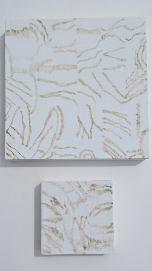 Pushing the materials through processes; using expressive mark-making; the work explores memory and experience through gesture; finding a language to convey this place as something tangible and ephemeral. These abstractions offer a place of restfulness. The process of deconstruction, extraction and reassembly reflects the constant change and flux that is seen in seascapes in one place. Further reducing the images to suggestions of line allows the work to become more diffuse and ephemeral.