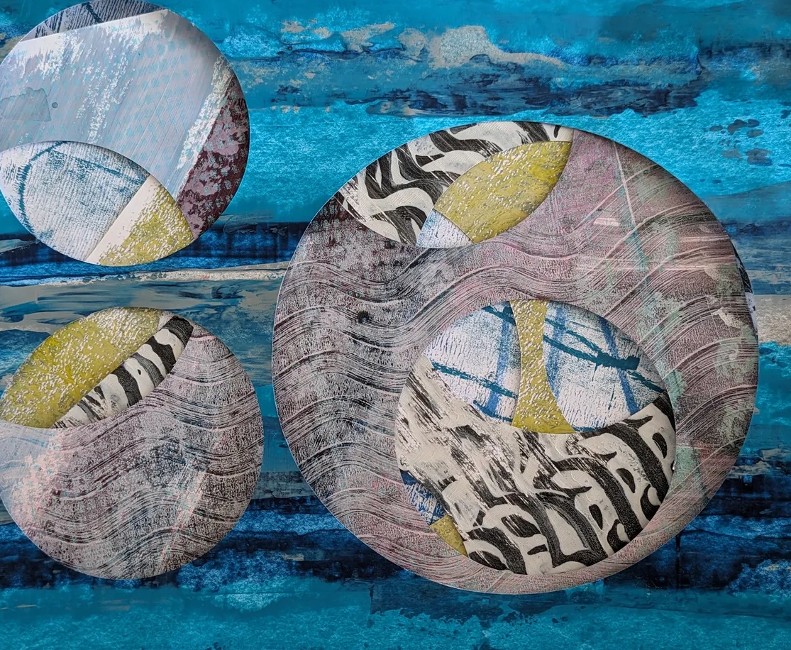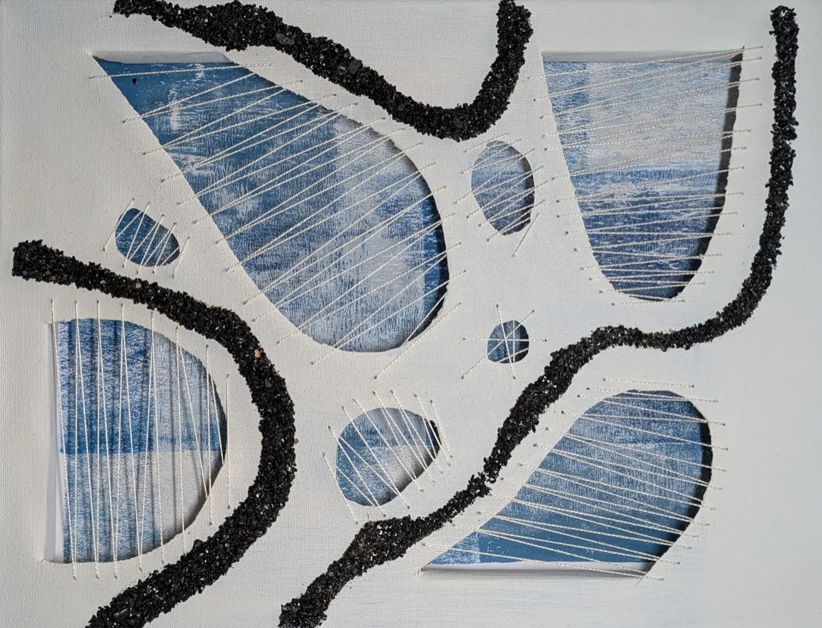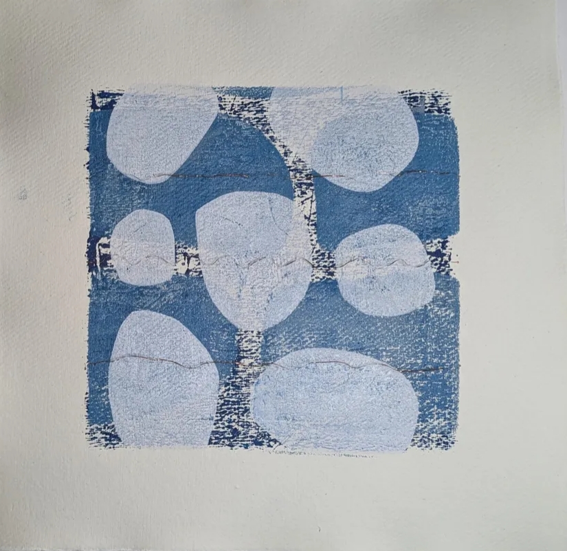 A gentle rendering of the sense of the sea... I am a mixed-media artist investigating my connection with the landscape and myself, exploring how these intersect in tangible form through spontaneous mark-making and print.