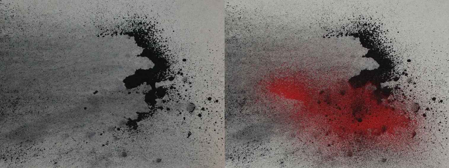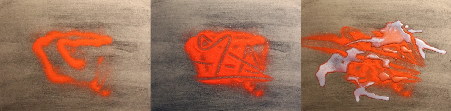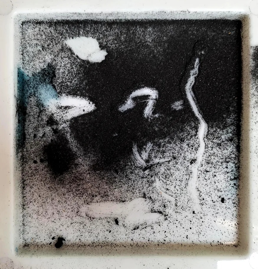 Different mediums best represented different themes; allowing paths in and manipulating sand and charcoal for transience, clay for abstract embodiment of armouring and flaws, physical performance for skills and struggles, and video of burning upright matches for the unpredictability of outcomes. A charcoal ‘figure’ attempts to move towards the light but as he does so, loses much of his pigment and composition as it flies off the board. I asked myself, ‘If he loses the darkness, is there anything left of him?’, and in many ways this typifies the message of the piece as a whole; in order to transform there must be risks and losses.