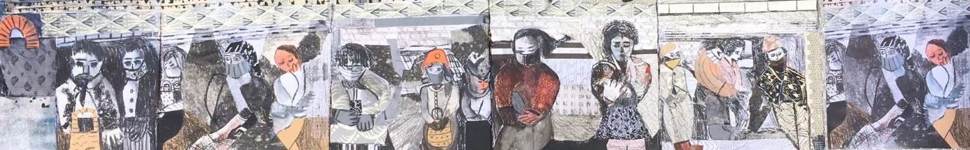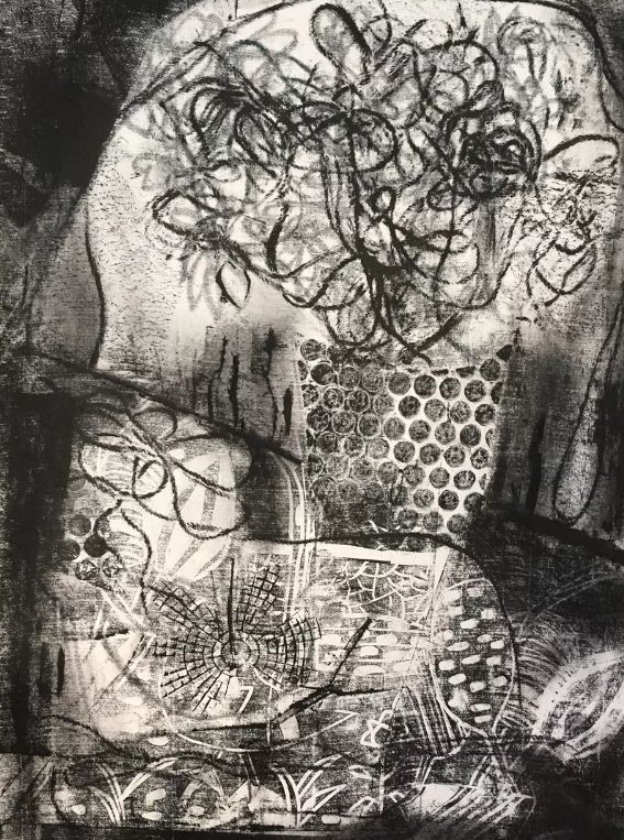 Jacket Identities considers how to present in a light-hearted way specific identities displayed on the outside. The use of hybrid prints gives physicality to the work, expressing pattern and texture. Collage reinforces this in the form of circles, leading one’s eye to the jackets. Experimental stamping and mixed media bring out the individuality of each jacket. Inspired by John Kiki’s spontaneous way of working…he reflects that his portraits are a mix of imagination, inspiration and chance: