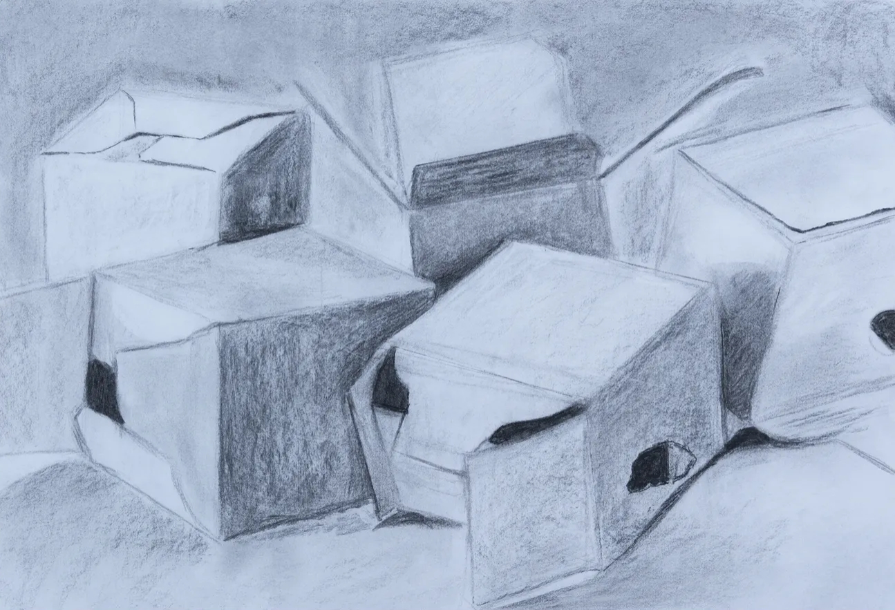 As Giorgio Morandi observed, “One can travel this world and see nothing. To achieve understanding it is necessary not to see many things, but to look hard at what you do see.” His still life works treat everyday objects with quiet intensity. With this drawing, the box is not just an object, but a structure of containment, of surfaces, edges, and hidden interiors. The five boxes are tightly arranged, generating a sense of pressure or containment. Each one is in a different state of openness, suggesting psychological states of concealment, exposure, or transition.