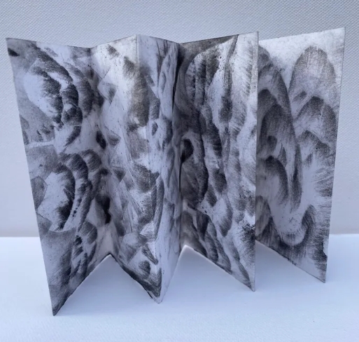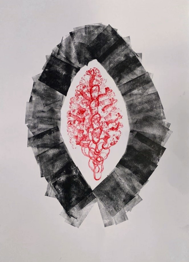 ‘Lifeline’ explores the importance of having a strong ‘outside’ and vibrant ‘inside’ during a period of profound change in my life; I drew and doodled. Every doodle started with angry dark circles but morphed into meditative and rhythmic ovals. As I drew, I thought about the responsibility I feel for elderly parent care as the oldest sibling and only daughter in a patriarchal family. I realised I’m dropping expectations I’ve absorbed and setting new ‘rules’ of shared responsibility that allow me to care while keeping my ‘inside’ nourished. As I ‘scribbled’ I found myself enjoying the combination of white/black/red. It reminded me of Japanese Enso meditation.