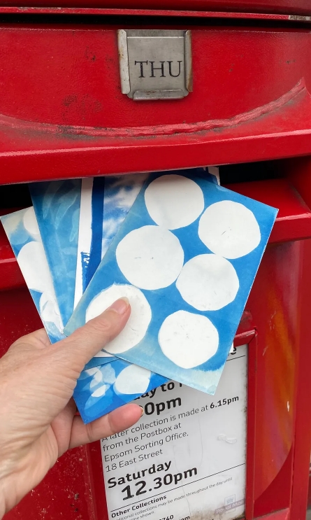 experiences of place — to the UK, Europe, Canada, New Zealand, America, and Australia. Once posted, they travelled, touched by different hands, passing through mechanical processes, small pieces of ‘mail art’ dispersed seen by others during the postal process. This created a sense of separation and loss, leaving me only with the