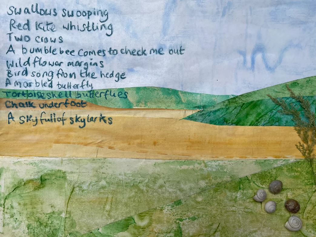 A Sky Full of Skylarks gives the viewer the experience of a moment of time in my special place. Lowbury Hill is a sacred place. Using en plein air sketching for inspiration, the work incorporates words and locally found natural materials to create a joyful moment with a sense of space with a view to the horizon and expanse of sky. In that moment I am aware of the natural details that break my attention – snatches of birdsong, a butterfly or grasses brushing my hand. I wrote what I heard and saw on my walk up Churn Road to the Ridgeway.