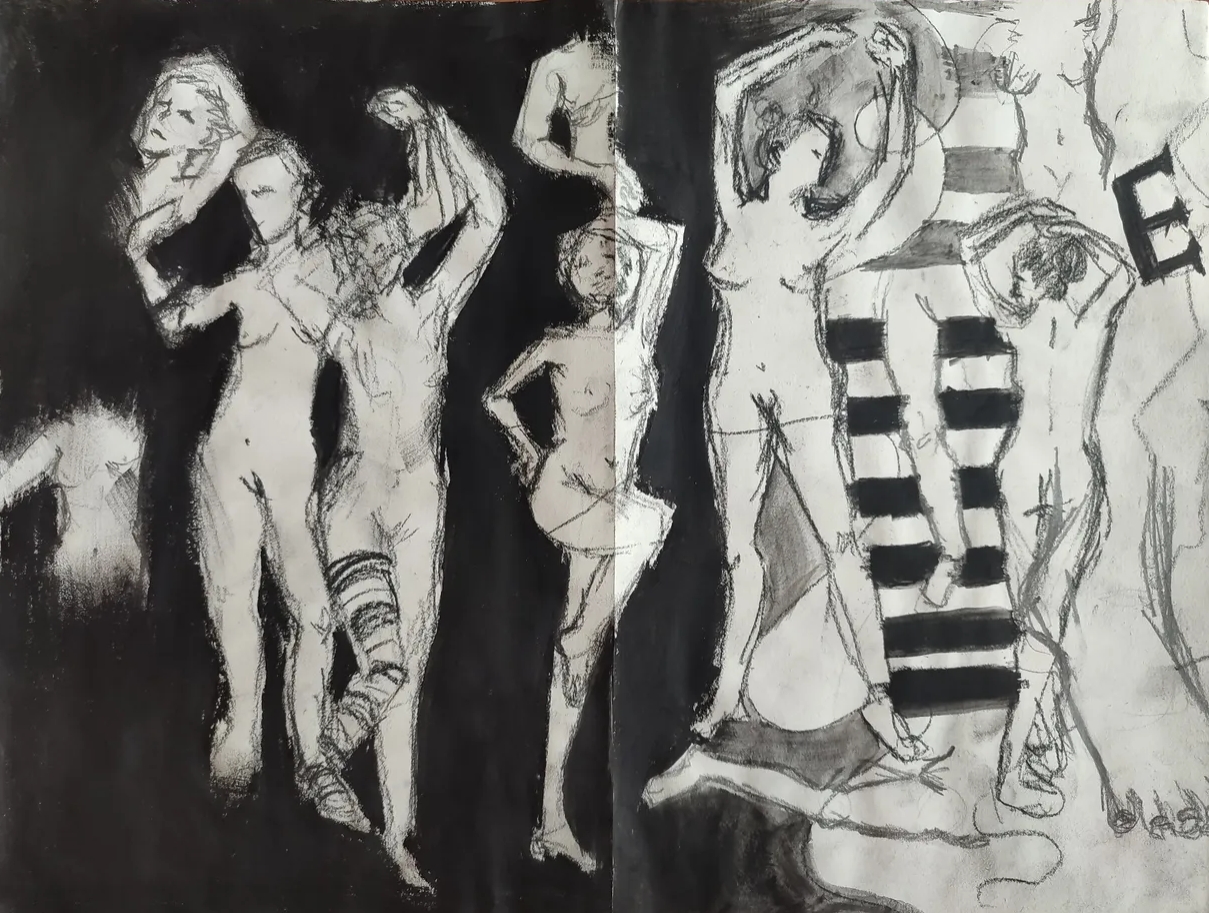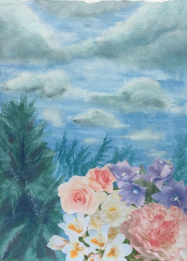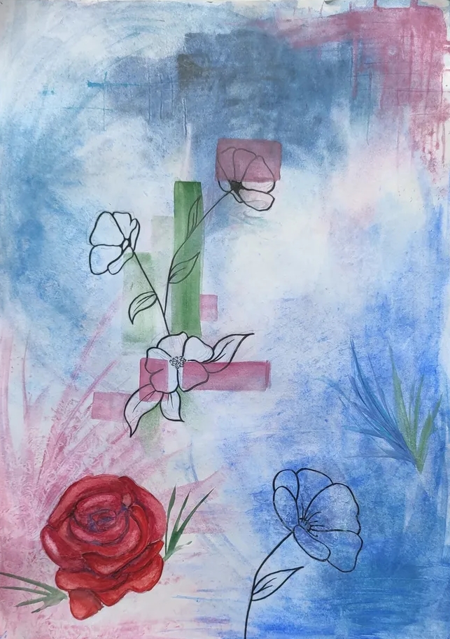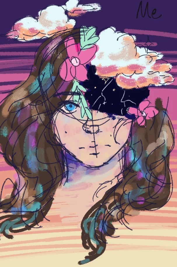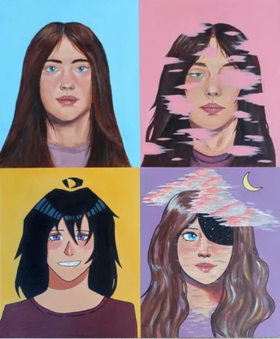The painting considers how an artist perceives and interprets themselves based on their appearance, and how that connects to their being. The different versions of myself represent me in similar yet in different styles. Me as I am, me with how I feel I am perceived, me in a realm of my own creation, and finally as how I see my inner self. The inspirations were Tanya Shatseva and her use of colours and adding symbolic images to her paintings and how she's full of “whimsical concepts”. Also Andy Warhol's composition and his print making artworks. The same image repeated over again but in a different way is what I wanted to convey. Though in Andy’s work “Shot Marilyns”, the colours and repetition conveys her "dynamism and emphasises her impact”. I wanted to show the same person in differing dynamics/perspectives.