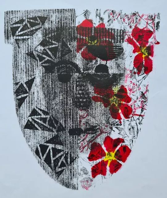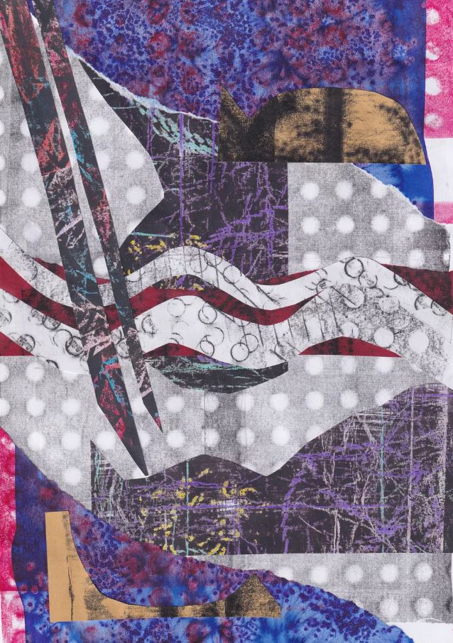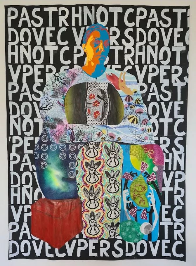 Each piece of the collage figure represents a ‘eureka’ moment, key encounter, or missed opportunity in my journey to re-discovering my true self. The body is depicted as strong and sturdy, telling a story of feelings aloud. I wanted the use of bright colours and bold lines to convey my boisterous personality and overwhelm the viewer, whilst drawing them into the work via the highly detailed and symbolic individual pieces. The prints are playful and direct with my feelings and communication. The collaged head is a nod to Shepard Fairey’s stencilled portrait of President Obama, whilst the ‘buried mask’ on the chest echoes the anxiety-pervaded work of Yayoi Kusama.