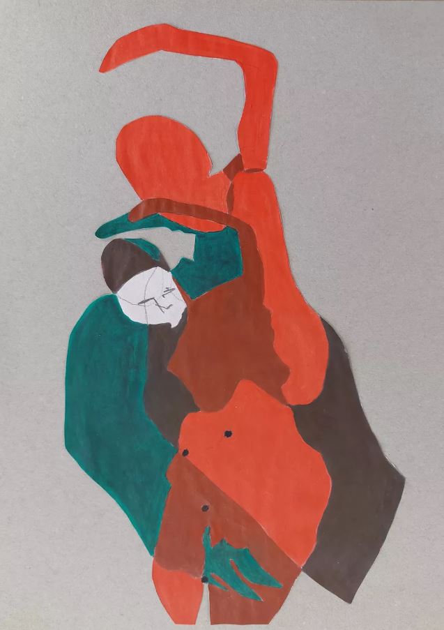 There is a dynamic relationship between multiple layers of forms; symbolic use of complementary colours; tone, texture and the use of collage creates depth; the eye is helped to move around the image; and there is some sense of intrigue.