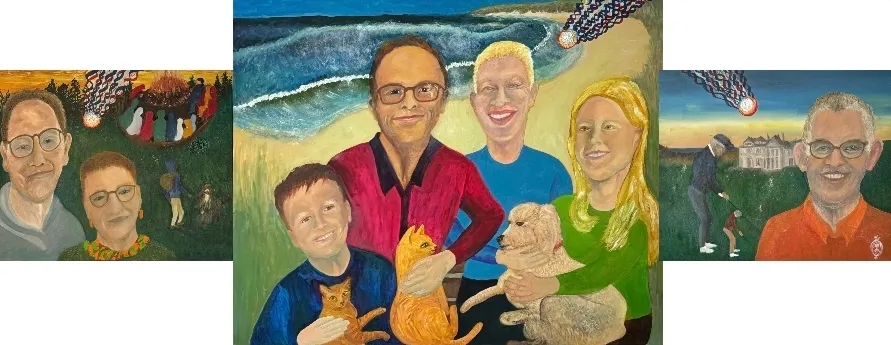 Now in my mid 80s, having had a lifetime of bringing up eleven children, my hope is that I have helped them grow into happy capable adults. My Re-Place triptych presents my birth children in their preferred worlds to pass to them my respect and love, to tell them of my pride in them. They are my replacement when I die as part of our ongoing family continuum.